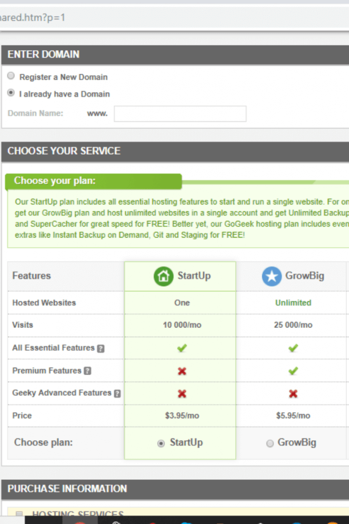 Choose I already have a domain and enter the name you registered at NameCheap.com. Choose the starter plan. For extras I have Siteground Scanner it helps me feel more secure that my site is protected from hackers. I’ve put a lot of work into it and I don’t want a hacker to mess with it.